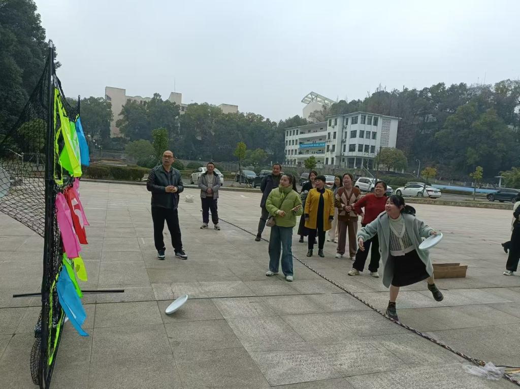 健步走活动结束后,趣味项目丢飞盘和拔河将现场气氛推向高潮。在趣味丢飞盘环节,william英国中文数学组与物理组女教师轮番上阵。她们手持飞盘,或屈膝蓄力,或助跑投掷,目光紧紧锁定前方插着彩色标志旗的目标区域。飞盘在空中划过一道道弧线,现场观众时而屏息凝视,时而爆发出惋惜或欢呼之声。两组女教师不断调整策略、相互鼓劲,最终双方以1 : 1的比分战平,现场充满了欢乐与活力。