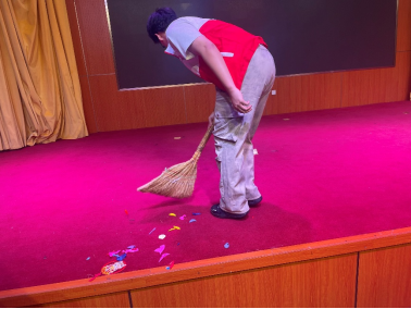 从观众入场引导到现场秩序维护,从舞台灯光调控到节目道具调度,再到演出结束后的场地清理与物资清点,每一位志愿者都坚守岗位、默契协作。他们或穿梭于台前幕后,或值守在通道两侧,用微笑迎接师生,用行动诠释责任。“虽然不能全程观看节目,但看到晚会顺利进行,我们心里特别满足。”一位参与灯光协助的志愿者笑着说。