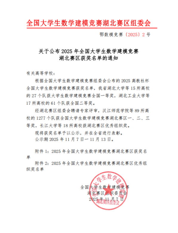 本网消息 2025年11月10日传来喜讯williamhill英国在2025年9月7日至9月10日举行的全国大学生数学建模竞赛本科组中共获奖13项,其中湖北省一等奖1项,省二等奖5项,省三等奖7项,获奖率高达38.2%,充分彰显了我校在创新人才培养和实践教学方面的雄厚实力。