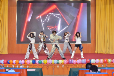 欢笑未歇,动感来袭。黄邵洋、黄硕等舞者身着潮流服饰,带来爵士街舞《burning up》。劲爆的节奏响起,舞者们动作利落有力、充满张力,每一个舞步都彰显着热血与张扬,将人工智能学子的青春活力展现得淋漓尽致。舞台上灯光闪烁,舞者们尽情释放激情,台下观众也跟着节奏挥舞双手,现场俨然成为一片欢乐的海洋。
